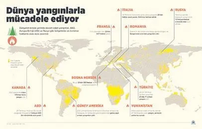 Yahu yalan atmadan önce NASA'nın 'FIRMS' adlı yangın bilgilendirme uydu haritasına girip bakın! Küresel ısınmayla birlikte dünyanın birçok yerinde orman yangınları devam ediyor. 'FIRMS'deki kırmızı noktalar dünyanın cayır cayır yandığını gösteriyor! Haritada ABD'den Rusya'ya, Güney Amerika'dan Afrika'nın kuzey, orta ve güney bölgesine ve Arap Körfezi'ne pek çok bölgeyi kırmızıya boyayan yangınlar; İtalya, İspanya, Yunanistan ve Romanya gibi birçok AB ülkesini de mücadeleye sevk etti. ABD'nin çeşitli bölgelerinde başlayan orman yangınları haftalardır devam ediyor. Şu ana kadar 80 bin hektarlık alan zarar gördü.