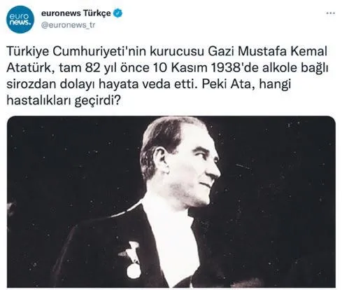 Fransız medya kuruluşu Euronews, 10 Kasım'a özel "Türkiye Cumhuriyeti'nin kurucusu Gazi Mustafa Kemal Atatürk, tam 82 yıl önce 10 Kasım 1938'de alkole bağlı sirozdan dolayı hayata veda etti" diye bir tweet paylaştı.