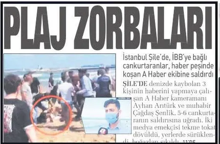 Karadeniz'de boğulup kaybolan vatandaşların haberini yapan A Haber muhabiri Çağdaş Şenlik ve kameraman Ayhan Arıtürk sahilde cankurtaranların saldırısına uğradı.