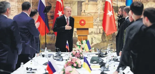 İstanbul'da Dolmabahçe Sarayı'nda kurulan masada buluşan Ukrayna ve Rusya heyetleri, Cumhurbaşkanı Erdoğan'ın salona girişini ayakta alkışladılar.