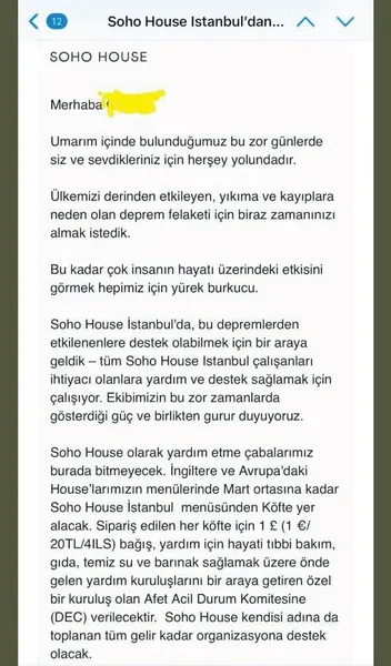 İstanbul'da özel üyelere hizmet veren sosyal kulüp Soho House depremzedelere yardım kampanyası düzenlemiş.