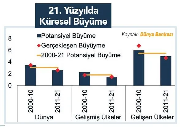 Küresel büyüme eskisi kadar tat vermiyor. Dünya Bankası'nın "Düşen Uzun Vadeli Büyüme Beklentileri" başlıklı son çalışması, küresel ekonomideki bu tıkanıklığı detaylarıyla ele almış. Küresel ekonomide geçtiğimiz 10 yıllık süreçte hem gerçekleşen büyümede hem de potansiyel büyümede kayda değer bir gerileme yaşandı. Bu performans kaybına neden olan faktörler şunlar: