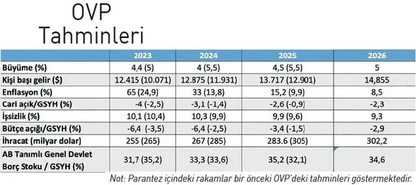OVP'nin tutturulması en kritik olan tahmini, 2024 yılına ait enflasyon rakamı olacak. Ekonomi yönetimi, enflasyonun bu yılı yüzde 65 ile kapatacağını öngörüyor. Bu güncel rakam, Merkez Bankası'nın temmuz ayında açıkladığı tahminin 7 puan üzerinde. Enflasyonun yılı yüzde 65'in birkaç puan daha üzerinde kapatma riski olsa da piyasalardaki genel kanı OVP tahminin gerçekçi olduğu yönünde. OVP'nin 2024'e dair enflasyon tahmini ise yüzde 33. Gelecek yıl enflasyonu bu seviyelere indirmek, tek haneli rakamları 2026'da yeniden görebilmek açısından oldukça belirleyici olacak. Mart 2024'te yerel seçimler var. O zamana kadar deflasyona yönelik tam kapsamlı bir politika setinin uygulamaya konması beklenmiyor. Enflasyonla mücadele kapsamında para ve maliye politikası arasındaki eşgüdümün tam anlamıyla sağlanması ve yapısal politikaların etkilerinin görülmesi en iyi ihtimalle önümüzdeki nisandan sonra gerçekleşecek.