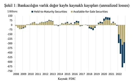 Bu mevduatların, pandemi döneminde yatırım için değerlendirilmesi sürecindeki tercih yanlışları, Fed'in agresif faiz artışları ile birleşti. Sonuçta da varlık değer kaybı kaynaklı ciddi kayıplar, faiz riski, kredi notu ve devamında da bankaya hücumlar, işleri içinden çıkılmaz bir hale soktu (Şekil 1).