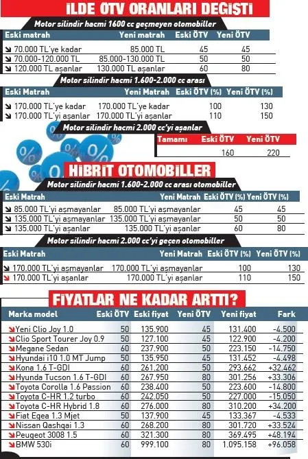Hibrit araçların ÖTV oranları da değişti. Motor silindir hacmi 1.600-2.000 cc arasındaki ÖTV matrahı 85 bin TL'ye kadar olan hibrit otolarda yüzde 45 olan ÖTV sabit bırakıldı. Aynı şekilde ÖTV matrahı 135 bin TL'yi aşmayan hibrit otoların yüzde 50'i olan ÖTV'sinde de değişiklik yapılmadı. ÖTÖ matrahı 135 bin TL'yi aşan hibritlerin ÖTV'si yüzde 60'dan 80'e, 170 bin TL'yi aşmayan hibritlerin ÖTV'si yüzde 110'dan 150'ye, 170 bin TL'yi aşanların ÖTV oranı ise yüzde 110'dan yüzde 150 çıktı.