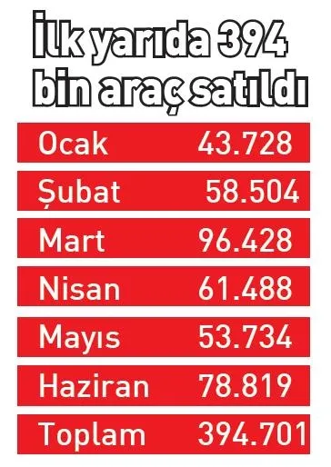 Nisan ve mayıs aylarında beklentilerin altında kalan otomotiv pazarı yazla birlikte yeniden hareketlendi. Otomotiv Distribütörleri Derneği (ODD) verilerine göre, haziranda binek otomobil ve hafif ticari araç satışları 78 bin 819 adet oldu. Pazar yüzde 12.5 seviyesinde büyüdü. Haziranda binek otomobil satışları yüzde 9.3 artarak 62 bin 348 adete, hafif ticari araç satışları ise yüzde 25.6 artarak 17 bin 471 adete yükseldi.