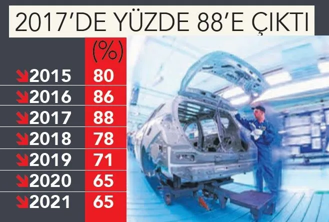 OTOMOTIV sanayisinin 2021 kapasite kullanım oranı yüzde 65 olarak gerçekleşti. Araç grubu bazında kapasite kullanım oranları ise hafif araçlarda (otomobil + hafif ticari araç) yüzde 64, kamyon grubunda yüzde 83, otobüsmidibüs grubunda yüzde 31 ve traktörde yüzde 74 oldu.