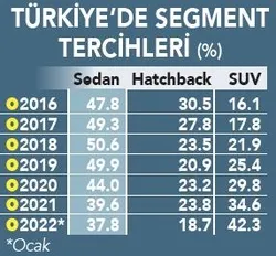 Otomotiv pazarının son beş yılına SUV modeller damga vurdu. 2016'da yüzde 16.1 olan SUV araçların pazar payı beş yılda 26.2 puan artışla yüzde 42.3'e yükseldi. Bu dönemde sedan otomobillerin pazar payı ise yüzde 47.8'den yüzde 37.8'e indi. Sedanların kaybı 10 puan oldu.