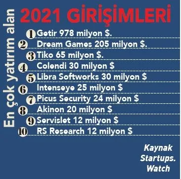 Startups.Watch 2021 yılında Türkiye'den çıkan, en çok yatırım alan 10 girişimi açıkladı. Listenin en başında yaklaşık 1 milyar dolar yatırım alan Getir ve 10'uncu sırada RS Research yer alıyor. Türkiye girişim ekosistemi 2021 yılını milyar dolarlık umut veren girişimlerle geride bırakıyor. Listede ikinci sırada 205 milyon dolar yatırımla Dream Games, üçüncü sırada 65 milyon dolar yatırımla Tiko bulunuyor. 10'uncu sırada ise 12 milyon dolar yatırımla kanser tedavisi için nano ilaç geliştiren biyoteknoloji ve derin teknoloji girişimi RS Research yer alıyor.