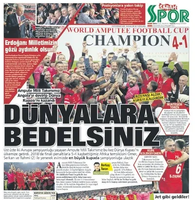 Ülkemizde sporda muhteşem başarılara imza atıyoruz. Salonlarda, sahalarda, ringlerde sporcularımızın zaferleriyle gururlanıyor, sevinç gözyaşlarıyla ağlıyoruz. Ampute Milli Takımımız, Türkiye'ye büyük başarı daha yaşatırken bu tarihi anı dün SABAH SPOR sayfalarında dolu dolu görkemli bir şekilde gören servis olduğumuz için mutluyuz. Türk bayrağının olduğu her yerde bir zafer, bir mutluluk söz konusu ise hakkını teslim etmek, gazetecilik olarak en büyük görevimiz. Reyting, F.Bahçe ya da başka yerlerde olsa da bu aslan yürekli insanların emeklerini gözardı edemeyiz. Sayın Cumhurbaşkanımız Recep Tayyip Erdoğan ve değerli bakanlarımız da bunu ifade ederken, mutlu aile fotoğrafının içinde yer alıp, gönüllerini ortaya koydular, çocukların yanlarında oldular. Bir kez daha tebrik ederim.