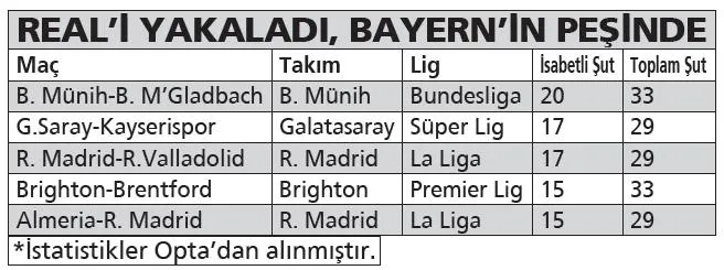 Çağdaş Atan'ın takımına karşı 17 isabetinde kaleci Bilal 10 kurtarışa imza atarken, Hatay maçını 4-0 kazanan F.Bahçe 15 isabetli şut attığında kaleci Erce'nin kurtarış hanesinde 9 yazıyordu. 6 gollü galibiyetle averajını +41'e yükselten Galatasaray, Avrupa'nın 5 büyük liginde bu sezon 20 isabetli şut atan B.Münih'in ardından Valladolid maçında 17 isabetli şut atmış R.Madrid ile birlikte 2. sırada yer aldı. B.Münih'in 20 isabetli şut attığı maçta Mönchengladbach kalecisi Yann Sommer 19 kurtarışa imza atmış, 90 dakika 1-1 berabere sonuçlanmıştı. Sakatlanan Neuer'in sezonu kapatması sonrasında Bayern Münih ara transferde kendisine geçit vermeyen ve Bundesliga tarihine en çok kurtarış yapan eldiven olarak geçen İsviçreli Sommer'i kadrosuna katmıştı.