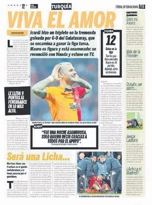 İCARDİ'NİN Kayserispor karşısında 45 dakikada 3 gol atıp 1 asist yapması ülkesi Arjantin'de de büyük yankı buldu. Ole gazetesi, 'Yaşasın aşk' manşetini atarken, Arjantin medyası yakın geçmişte eşi Wanda Nara ile ayrılma noktasına gelen İcardi'nin özel hayatındaki tüm sorunları geride bıraktığını ve Buenos Aires'te MasterChef programına katılarak Wanda'ya olan sevgisini bu destekle ifade ettiğini okuyucularına duyurdu. Gazete, Başakşehir maçından sonra sosyal medyadan 'Utanç, Skandal, Yılın Soygunu' mesajı atan Mauro İcardi'ye 150 bin TL (7 bin Euro) ceza verilmesinin ardından Tangocu yıldızın cezayı Kayseri maçında 3 golle kestiğini ifade etti.