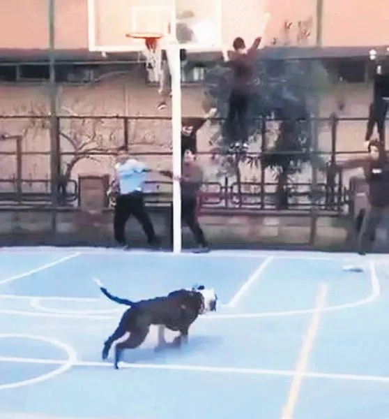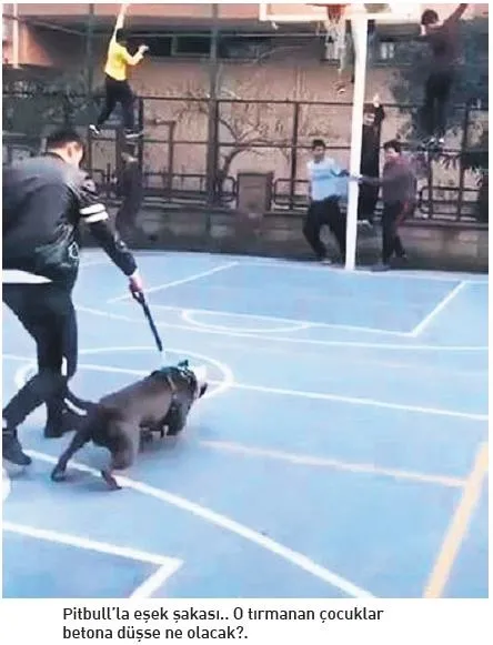 Bir pitbull sahibi, tasması ile(!) dolaşmaya çıkardığı köpeğiyle mahalledeki basketbol sahasında oynayan çocuklara "Eşek kere eşek" şakası yapmaya karar vermiş, köpeği ile oyun sahasına dalmış.