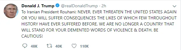 ABD Başkanı Donald Trump, İran Cumhurbaşkanı Hasan Ruhani'ye yönelik, "Bir daha asla ABD'yi tehdit etme yoksa tarihte daha önce çok az kişinin gördüğü sonuçlara katlanırsın." ifadesini kullandı.
