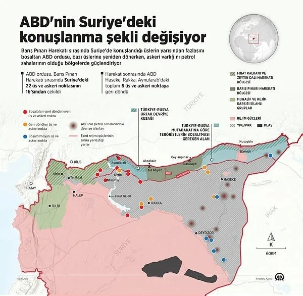ABD ordusu, Barış Pınarı Harekatı sırasında Suriye'deki 16 üs ve askeri noktasından çekilmişti. Harekat sonrasında ABD askerleri Haseke, Rakka, Aynularab'daki toplam 6 üs ve askeri noktaya geri dönmüştü.