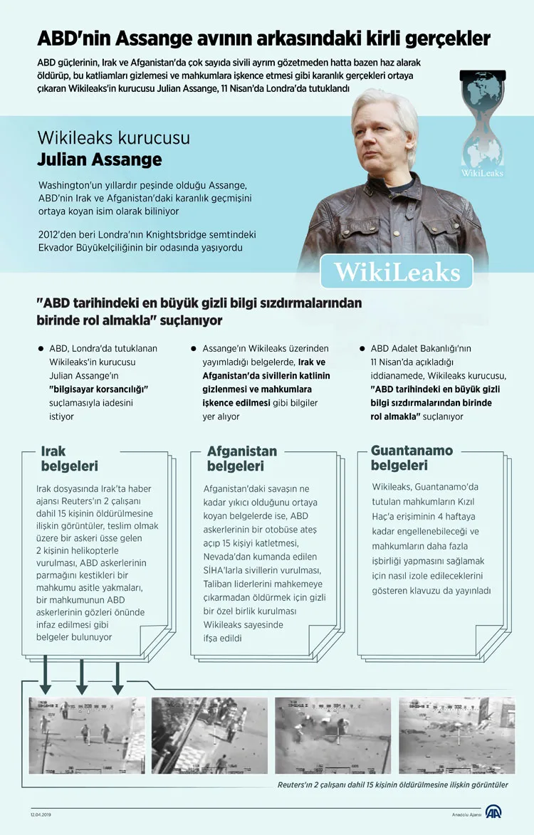 Dünya, ABD güçlerinin, Irak ve Afganistan'da çok sayıda sivili ayrım gözetmeden öldürüp, bu katliamları gizlemesi ve mahkumlara işkence etmesi gibi karanlık gerçekleri Wikileaks'in kurucusu Julian Assange sayesinde öğrendi. Washington yönetimi, bu gerçekleri ortaya çıkardığı için Assange'ın İngiltere'den iadesini istiyor.