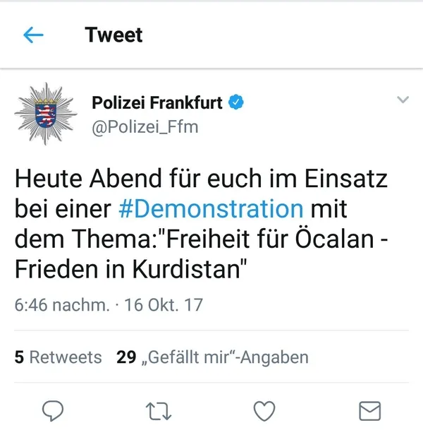 Şehirde terör örgütü PKK'nın gösterisine izin veren Frankfurt Emniyeti, twitter hesabından da konu hakkında bir açıklama yayınlayarak, ''Bu akşam sizin için şu konuda bir gösteride görevdeyiz: "Öcalan için özgürlük - Kürdistan için barış" ifadesine yer verdi.