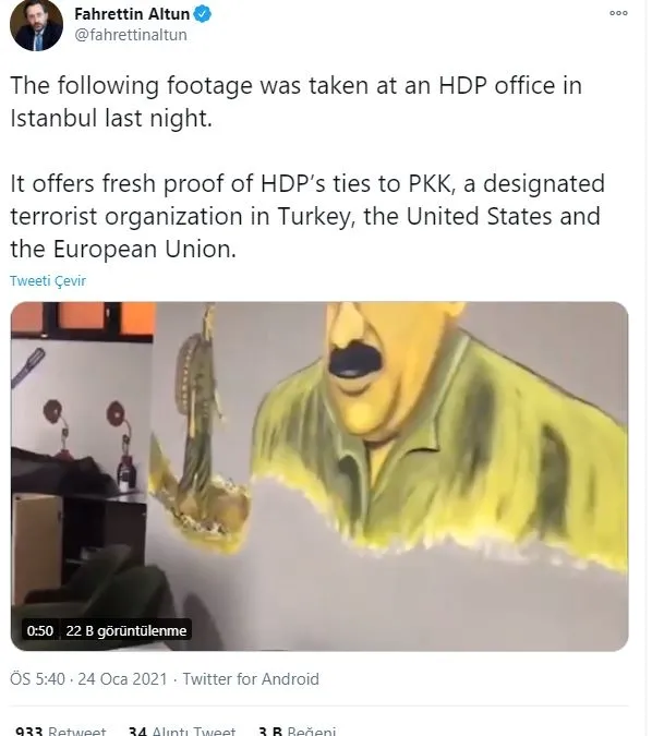 İletişim Başkanı Fahrettin Altun, sosyal medya hesabından yaptığı İngilizce paylaşımında HDP Esenyurt İlçe Başkanlığı binasına düzenlenen operasyonun görüntülerine yer vererek, "Batı, HDP/PKK yalanlarını yaymayı bırakmalı ve gerçeği söylemeli" çağrısında bulundu.