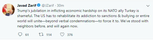 İran Dışişleri Bakanı Muhammed Cevad Zarif, Twitter hesabından yaptığı paylaşımda, "Trump'ın NATO müttefiki Türkiye'ye ekonomik zorlukları coşkuyla dayatması utanç verici. ABD yaptırımlara ve zorbalığa bağımlılığını düzeltmeli aksi takdirde tüm dünya ülkeleri onu zorlamak için sözlü kınamaların ötesine geçecektir. Biz daha önce de komşularımızın yanındaydık şimdi de yanlarında olacağız." ifadelerini kullandı.
