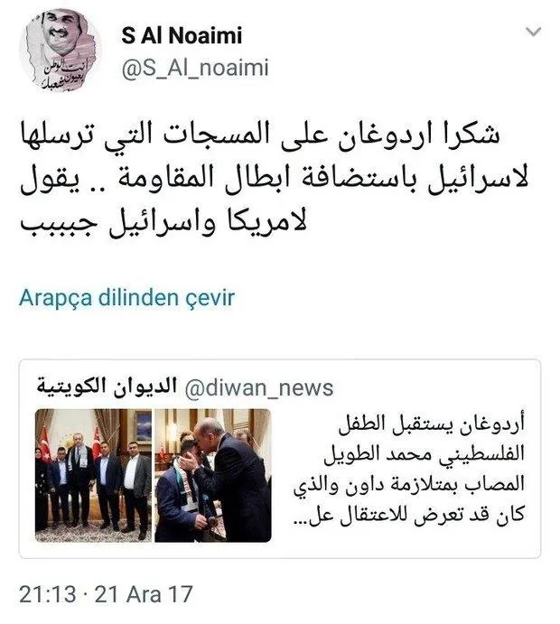Cumhurbaşkanı Erdoğan, Trump'ın Kudüs'ü İsrail'in başkenti olarak tanımasının ardından en sert tepkiyi gösterdi ve İsrail terörünü dünyaya haykırdı. Dünyanın ABD'nin tehditlerine boyun eğmemesi gerektiğini belirten Erdoğan, dünyaya çağrı yapmıştı. Bu akşam BM'de 128 oyla Kudüs kararının kabul edilmesiyle, İslam dünyasında 'Teşekkürler Erdoğan' hashtagiyle tweetler atıldı.