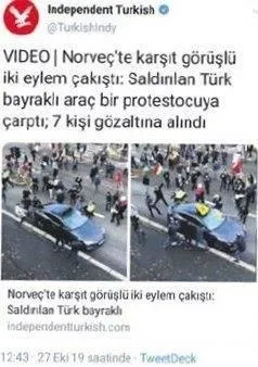 Oslo'da, terör örgütü PKK yandaşları Türk ailenin aracına saldırdı. Barış Pınarı Harekatı'na destek için düzenlenen gösteriden dönenlere PKK'lılar saldırdı. Saldırganlar ile Türk vatandaşları eş tutuldu. Haber, "Norveç'te karşıt görüşlü iki eylem çakıştı" başlığıyla verildi.