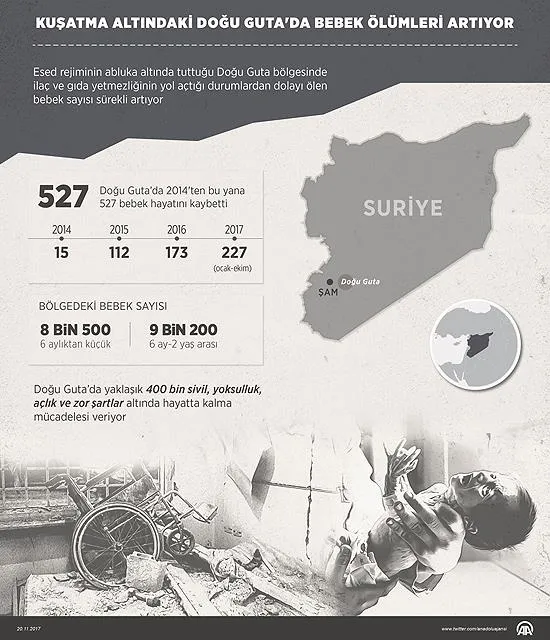 Ateşkese rağmen Esad rejiminin, Doğu Guta'daki ilçe ve beldelerine yönelik saldırıları aralıksız sürüyor. Doğu Guta'ya kaçak yollarla sokulabilen temel gıda ürünleri ve ilaçların girişi bir süre önce durdu.