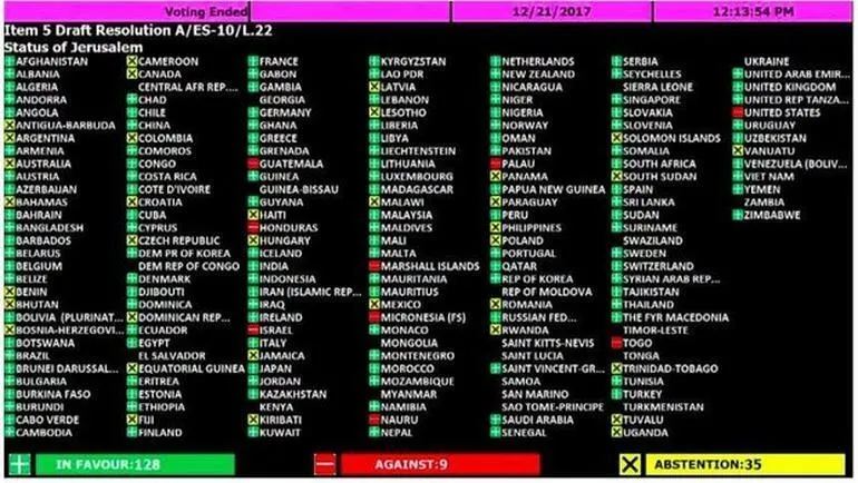 Birleşmiş Milletler'de (BM) Genel Kurulu'nda ABD'nin Güvenlik Konseyi'nde veto ettiği Kudüs tasarısı kabul edildi. 128 ülke kabul, 9 ülke ret, 35 ülke çekimser oy kullandı. Oylamada ABD ve İsrail'in yanında Palau, Guatamala, Togo, Nauru, Honduras, Marshall Adaları, Mikronezya ülkeleri ret oyu verdi. ABD'nin oylama öncesinde 'finansal yardımı keseriz' tehdidinin oylamanın akışına etkisi merak konusu oldu.