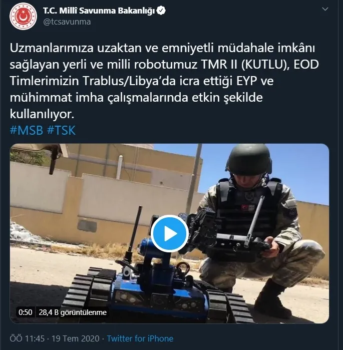 Bakanlığın twitter hesabından yapılan paylaşımda, uzaktan ve emniyetli müdahale imkanı sağlayan yerli ve milli robot TMR 2'nin, Mayın, Patlayıcı Madde Arama ve İmha (EOD) timlerinin Trablus/Libya'da icra ettiği EYP ve mühimmat imha çalışmalarında etkin şekilde kullanıldığı kaydedildi.