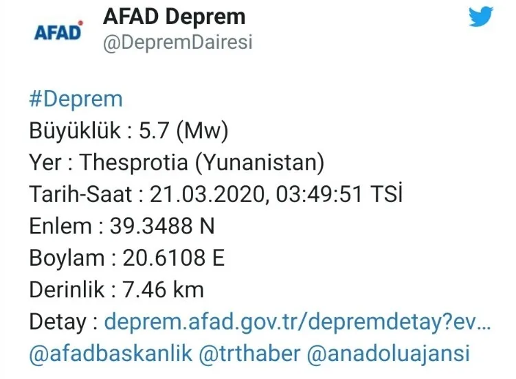 Kandilli Rasathanesi ve AFAD anlık olarak yaşanan son depremler listesini yayınlamaya devam ediyor. Dün gece komşu ülke Yunanistan'da yaşanan depremi AFAD sosyal medya hesabı üzerinden paylaştı. İşte yaşanan depremin ayrıntıları;