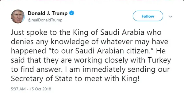 Trump, bu açıklamasından kısa süre önce Twitter hesabından yaptığı paylaşımda, "Suudi Arabistan vatandaşına ne olduğu konusunda bir bilgisi olmadığını söyleyen Suudi Arabistan Kralı ile konuştum. Kral bana, olanlara yanıt bulmak için Türkiye ile yakın olarak çalıştıklarını söyledi." ifadelerini kullanmıştı.