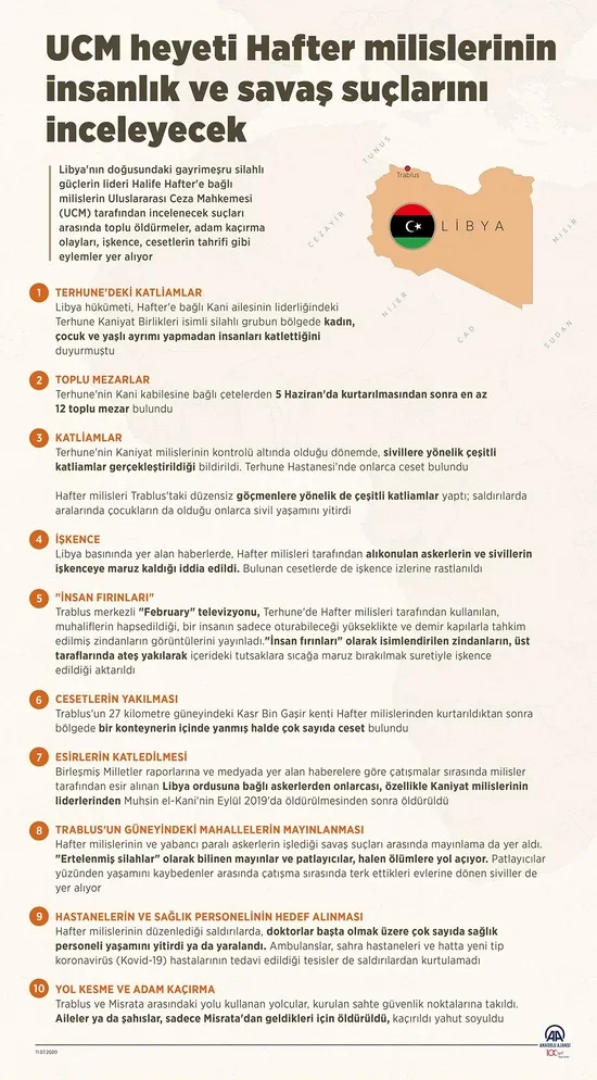 Libya'nın doğusundaki gayrimeşru silahlı güçlerin lideri Halife Hafter'e bağlı milislerin UCM tarafından incelenecek suçları arasında toplu öldürmeler, adam kaçırma olayları, işkence, cesetlerin tahrifi gibi eylemler yer alıyor.