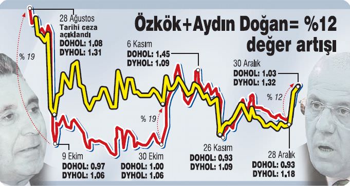 Doğan Grubu'ndaki yeniden yapılanma sonrası hisseler primli. Ertuğrul Özkök'ün Hürriyet Genel Yayın Yönetmenliğini bıraktığı önceki gün Doğan Yayın Holding hisseleri yüzde 2 kadar prim yapmıştı. Aydın Doğan'ın görevi bırakması ve yeniden yapılanma haberinin ardından değer artışı dün hızlandı ve Doğan Grubu hisseleri günü yüzde 10'luk değer artışlarıyla tamamladı.
