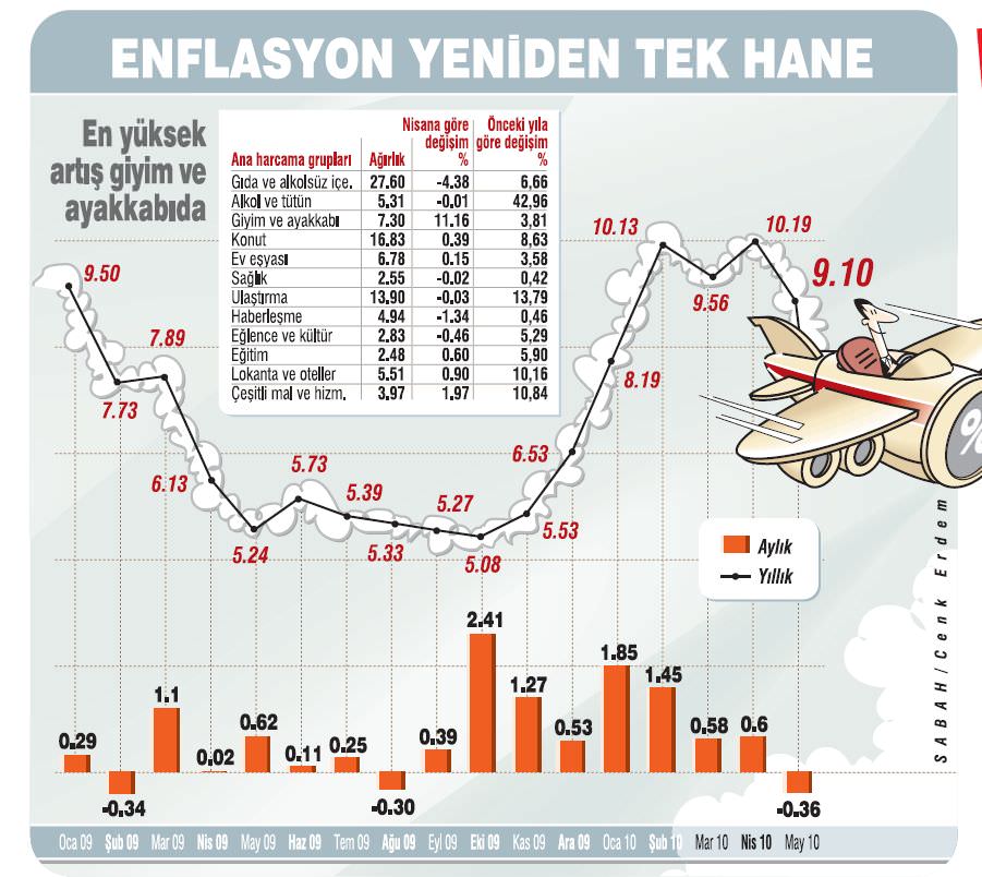 Başbakan Tayyip Erdoğan'ın kırmızı et fiyatlarındaki spekülatif yükselişi durdurmak için attığı adımlar sonuç verdi. Erdoğan'ın et spekülatörlerine yönelik sert açıklamaları, peşi sıra Tarım Bakanlığı'nın yurtdışından et ithalatı için açtığı ihale daha ithal et sınırdan içeri girmeden fiyatları aşağı çekti. TÜFE'yi gıda, gıdayı bolluk ve et spekülasyonunun engellenmesi aşağı çekti. Mayıs ayı verileri enflasyonda geçtiğimiz ay beklentilerin tam aksine bir düşüş yaşandığını gösterdi. Türkiye İstatistik Kurumu (TÜİK)verilerine göre tüketici fiyatları endeksi (TÜFE) mayısta aylık bazda yüzde 0.36 geriledi ve yıllık enflasyonu yüzde 9.10 ile tekrar tek haneye çekti. Düşüşün neredeyse tek sebebi ise gıda fiyatları oldu. Çünkü gıda fiyatları mayısta yüzde 4.38 geriledi ve yıllık bazda artışı yüzde 6.66 ile TÜFE'nin bir hayli altına indi.