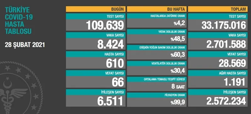 Haftalık verilere göre, bu hafta hastalarda zatürre oranı yüzde 3,6, yatak doluluk oranı yüzde 49,1, erişkin yoğun bakım doluluk oranı yüzde 63,2, ventilatör doluluk oranı yüzde 28,3, ortalama temaslı tespit süresi 8 saat, filyasyon oranı yüzde 99,9 olarak kayda geçti.