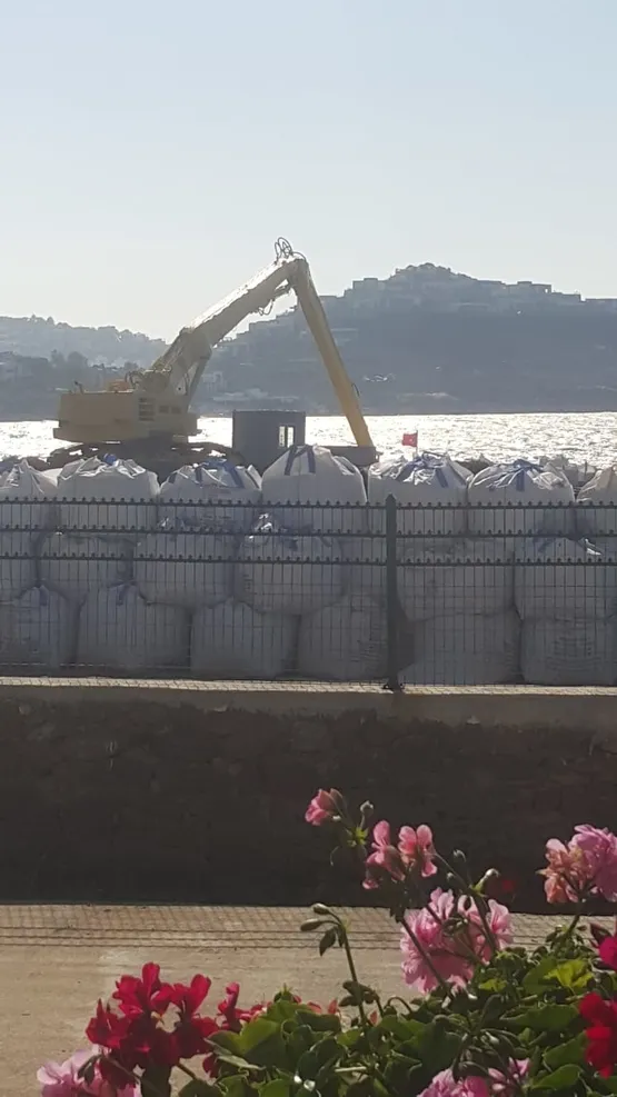 Daha sonra onlarca tır kepçenin çalıştığı noktaya çuvallarla getirilen beyaz kum denize dozerle boşaltıldı. Ayrıca denizin içine gece vakti beton dubalar yerleştirildiği öğrenildi.