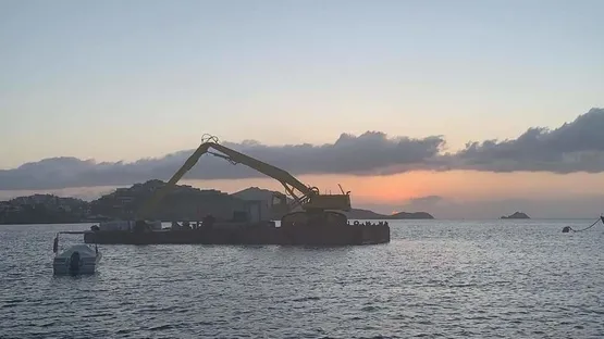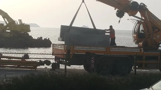 Bir hafta önce gemiyle getirilip platform üzerine konulan kepçenin denizi eştiği görüldü. Bu sırada denizin ekolojik dengesine büyük zarar verildi.