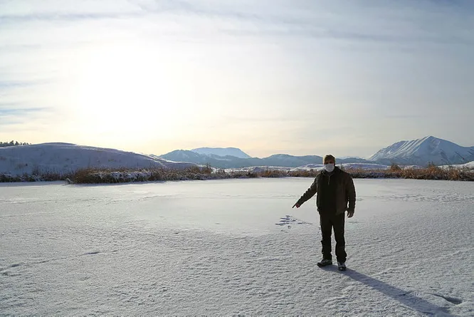Bölgede yaşayan Bayram Yücel, "Aşırı soğuklardan dolayı gölün yüzeyi tamamen buz tutmuş durumda. Yazın derin olduğu için giremediğimiz gölün üzerinde şu anda çok rahat şekilde geziyoruz." dedi.