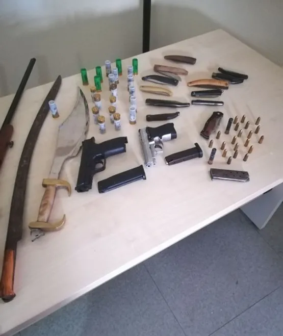 Aramada 3 ruhsatsız av tüfeği, biri kurusıkı diğeri bilye atan 2 tabanca, 12 bıçak ile pala, kılıç, 3 şarjör, 23 av tüfeği fişeği ve 20 kurusıkı tabanca mermisi ele geçirildi.