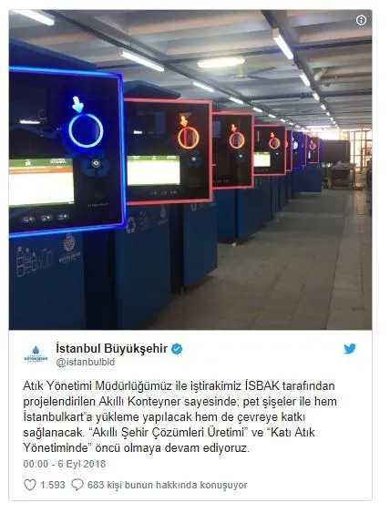 Türkiye'nin mega kenti İstanbul'da Büyükşehir Belediyesi çevreci bir hizmeti daha devreye sokmaya hazırlanıyor. Belediyenin iştiraklerinden olan İSBAK'ın yaptığı makineler içine attığınız pet şişe karşılığında İstanbulkart'a yükleme yapacak. İSBAK'ın resmi twitter hesabından duyurulan yenilikle beraber, çevreye büyük zararı olan pet şişeler de böylece geri dönüşümde kullanılmış olacak.
