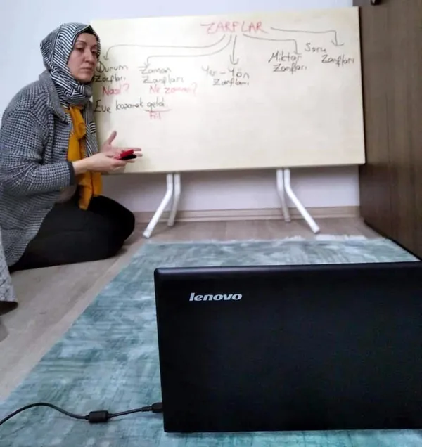 Öğrencilerinden uzak kalan öğretmenlerimiz, ders işlemek için çeşitli çözümler buluyor. Tekirdağ'da Türkçe öğretmeni Melike Büyük Dinçer, evindeki yemek masasını tahta haline getirerek öğrencilerine ders anlattı.
