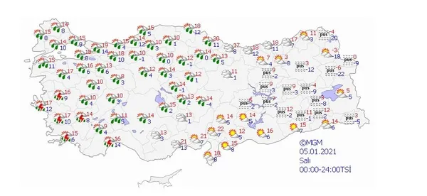 Meteoroloji Genel Müdürlüğü tarafından yapılan son değerlendirmelere göre; Yurdun batı kesimlerinin parçalı ve yer yer çok bulutlu, öğle saatlerinde Çanakkale ve İzmir'in kıyı kesimlerinin, akşam saatlerinden itibaren ise Marmara'nın batısı, Kıyı Ege, Manisa, Uşak, Denizli ve Burdur çevreleri ile Antalya'nın batı kesimlerinin sağanak ve yer yer gökgürültülü sağanak yağışlı, diğer yerlerin az bulutlu ve açık geçeceği tahmin ediliyor.