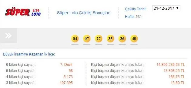 Milli Piyango İdaresi'nin düzenlediği Süper Loto oyununun 531'nci hafta çekilişi yapıldı. Çekiliş sonucu bu haftanın kazandıran numaraları 4, 7, 27, 35, 36 ve 40 oldu. Çekiliş sonuçlarına göre 6 bilen çıkmayınca 14 milyon 866 bin 236 lira 63 kuruş haftaya devretti. İşte Süper Loto çekiliş sonuçları hakkında tüm detaylar!