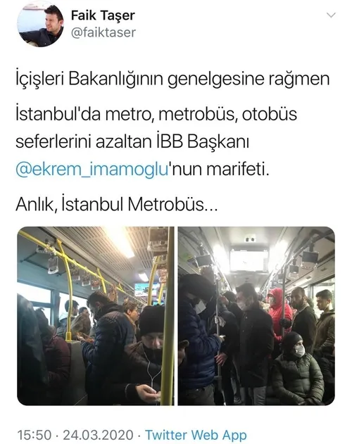 Sosyal medyada Faik Taşer isimli kullanıcı, İstanbul Metrobüs kullanıcılarının durumunu anlık olarak 15.50'de çekilen fotoğrafla paylaştı. İçişleri Bakanlığı'nın genelgesine rağmen İstanbul'da metro, metrobüs, otobüs seferleri azaltan İBB Başkanı @ekrem_imamoglu'nun marifeti" diyerek toplu taşımadaki tedbirsizliğe tepki gösterdi.