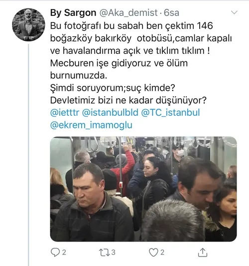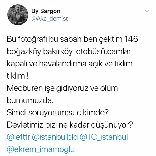 Sosyal medyada By Sargon ismini kullanan Twitter kullancısı ise 146 Boğazköy-Bakırköy otobüsünde çektiği bir fotoğrafı paylaştı. Otobüse binmek zorunda kalan yolcu, "Bu fotoğrafı bu sabah ben çektim 146 Boğazköt-Bakırköy otobüsü, camlar kapalı ve havalandırma açık ve tıklım tıklım! Mecburen işe gidiyoruz ve ölüm burnumuzda. Şimdi soruyorum; suç kimde? Devletimiz bizi ne kadar düşünüyor? İetttr @istanbulbld @TC_istanbul @ekrem_imamoglu" diyerek otobüs seferlerindeki duruma tepki gösterdi.
