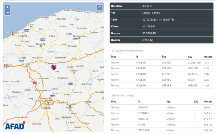 AFAD tarafından Çankırı'da saatler 14:46'yı gösterdiğinde meydana gelen depreme ilişkin detaylar paylaşıldı. AFAD deprem detay sayfasında yer alan verilere göre söz konusu depremin Çankırı'nın Çerkes ilçesinde meydana geldiği görülürken şiddet ve derinlik bilgileri de kamuoyu ile paylaşıldı.