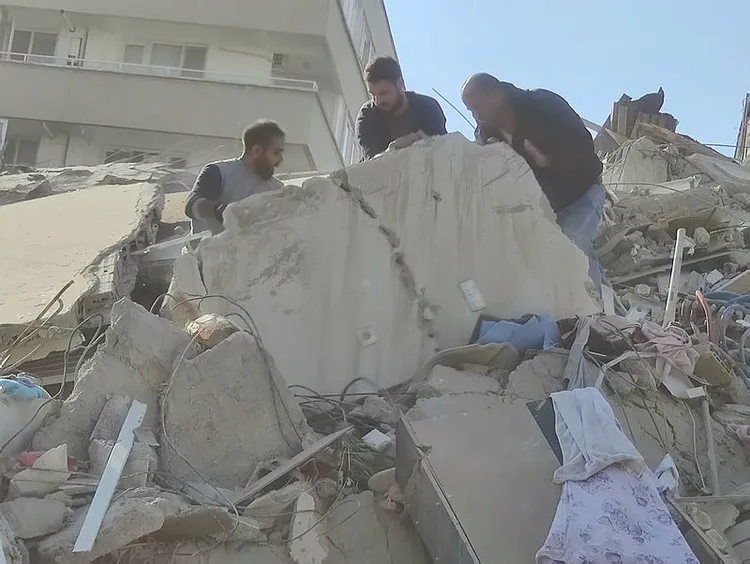 İzmir'in Bayraklı ilçesi 1593 Sokak'ta deprem nedeniyle yıkılan binanın enkazından 3 kişi yaralı çıkarıldı.