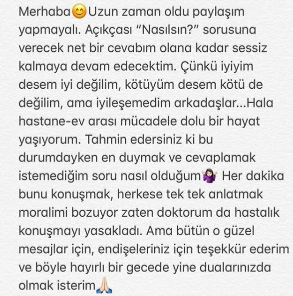 "Merhaba... Uzun zaman oldu paylaşım yapmayalı. Açıkçası 'Nasılsın?' sorusuna verecek net bir cevabım olana kadar sessiz kalmaya devam edecektim. Çünkü 'İyiyim' desem iyi değilim, 'Kötüyüm' desem kötü de değilim ama iyileşemedim arkadaşlar. Hala hastane-ev arası mücadele dolu bir hayat yaşıyorum. Tahmin edersiniz ki bu durumdayken en duymak ve cevaplamak istemediğim soru nasıl olduğum. Her dakika bunu konuşmak, herkese tek tek anlatmak moralimi bozuyor. Zaten doktorum da hastalık konuşmayı yasakladı ama bütün o güzel mesajlar için, endişeleriniz için teşekkür ederim ve böyle hayırlı bir gecede yine dualarınızda olmak isterim."