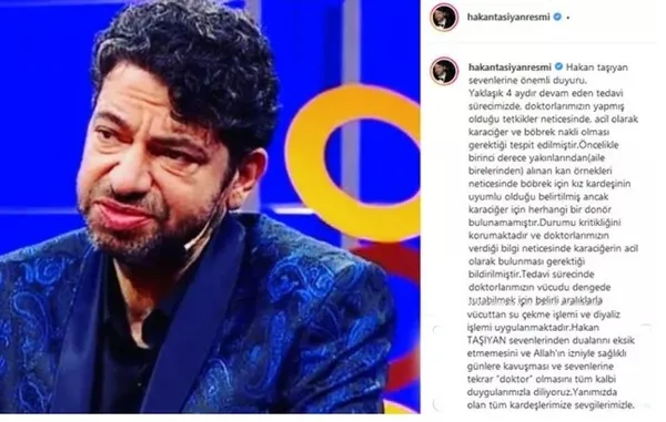 "Hakan taşıyansevenlerine önemli duyuru. Yaklaşık 4 aydır devam eden tedavi sürecimizde, doktorlarımızın yapmış olduğu tetkikler neticesinde, acil olarak karaciğer ve böbrek nakli olması gerektiği tespit edilmiştir. Öncelikle birinci derece yakınlarından (aile birelerinden) alınan kan örnekleri neticesinde böbrek için kız kardeşinin uyumlu olduğu belirtilmiş ancak karaciğer için herhangi bir donör bulunamamıştır.