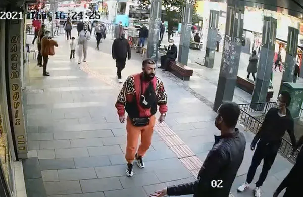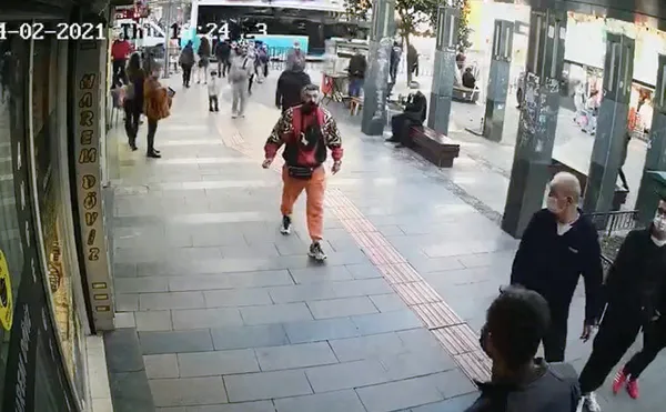 Taciz olayı, bölgedeki bir işyerinin güvenlik kameraları tarafından da kaydedildi. Görüntülerde trafiğe kapalı yolda eşi ve çocuğuyla yürümekte olan kadın çocuğuyla ilgilenmek için durduğu anda şüpheli F.K.'nın elle taciz ettiği anlar kayıtlara girdi.