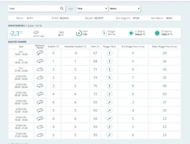 Tokat için 12 Şubat 2020 hava durumu tahmini: Hafif kar yağışlı, sıcaklık 5 derece